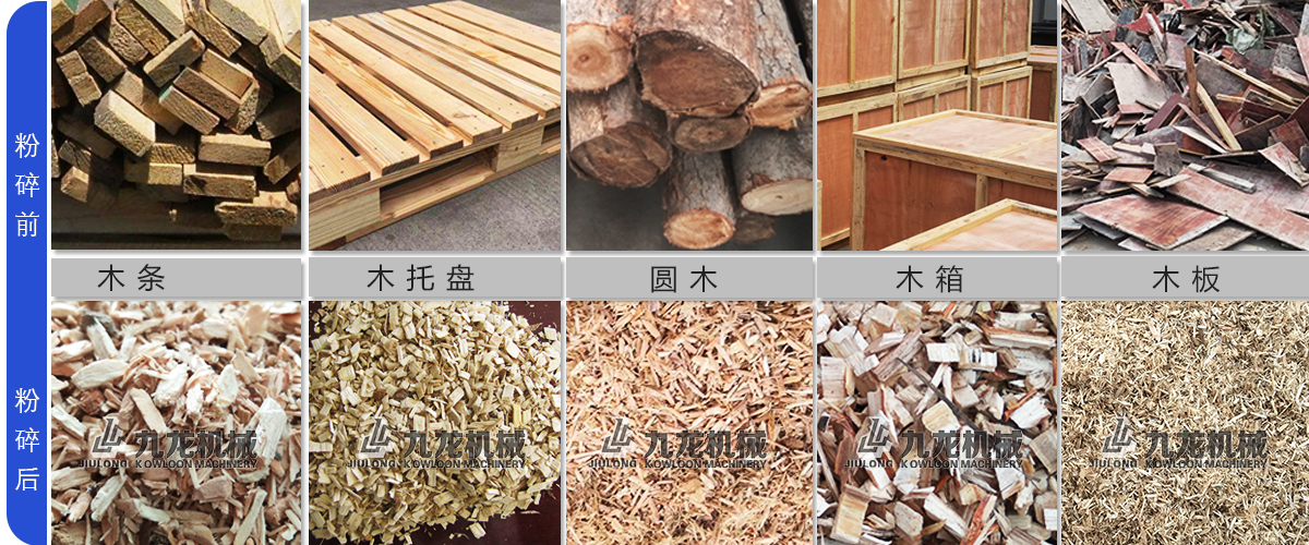 各種廢舊木材、板材料、木托盤、下腳料、舊家具、木板、木箱等?,F在粉碎木材和農作物的人越來越多,木材破碎后可以應用在電廠發電,制作香行業、能源棒的生產和菌菇生產養殖等等不同的領域。